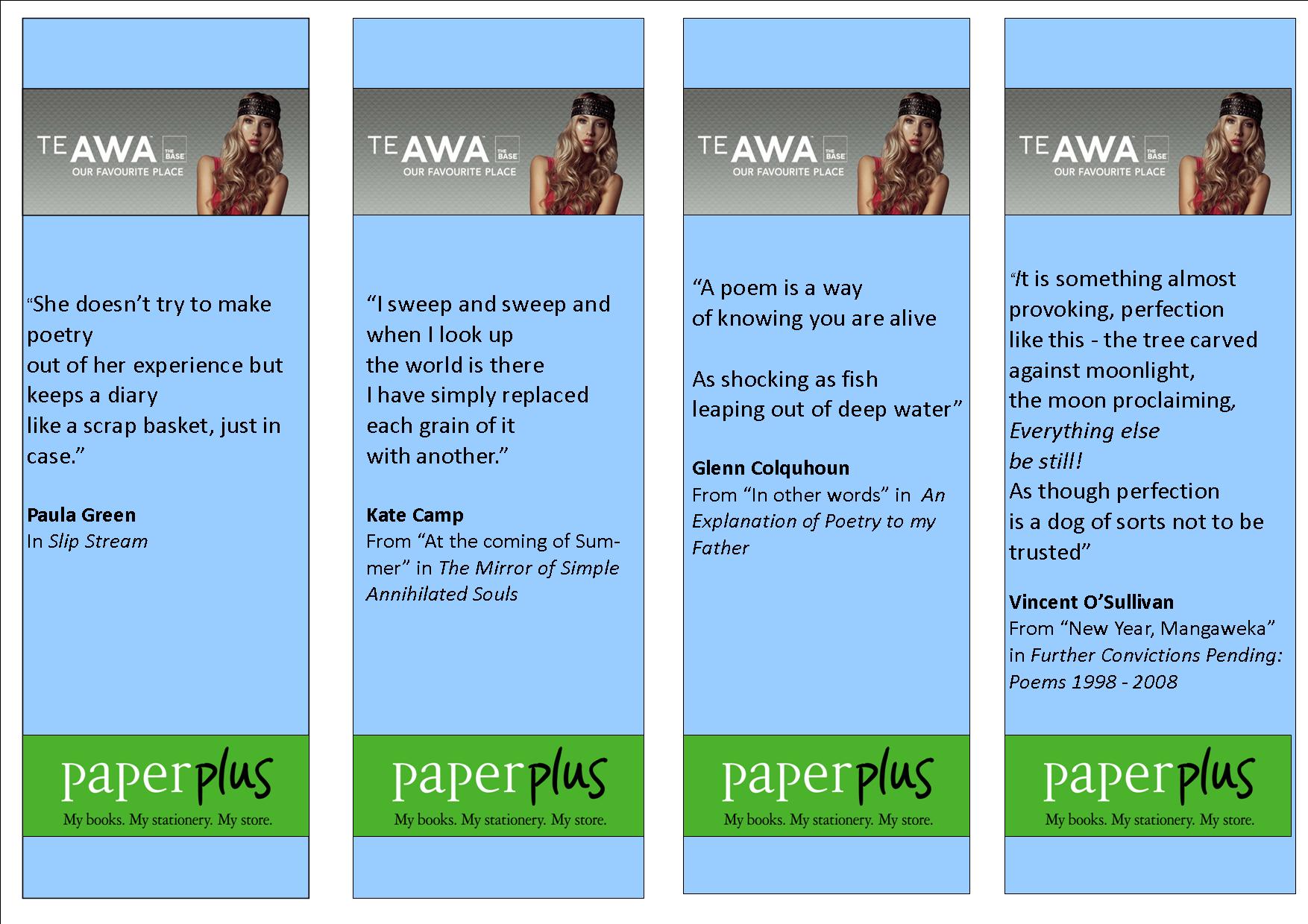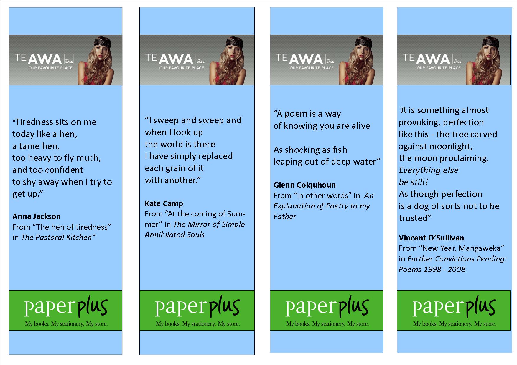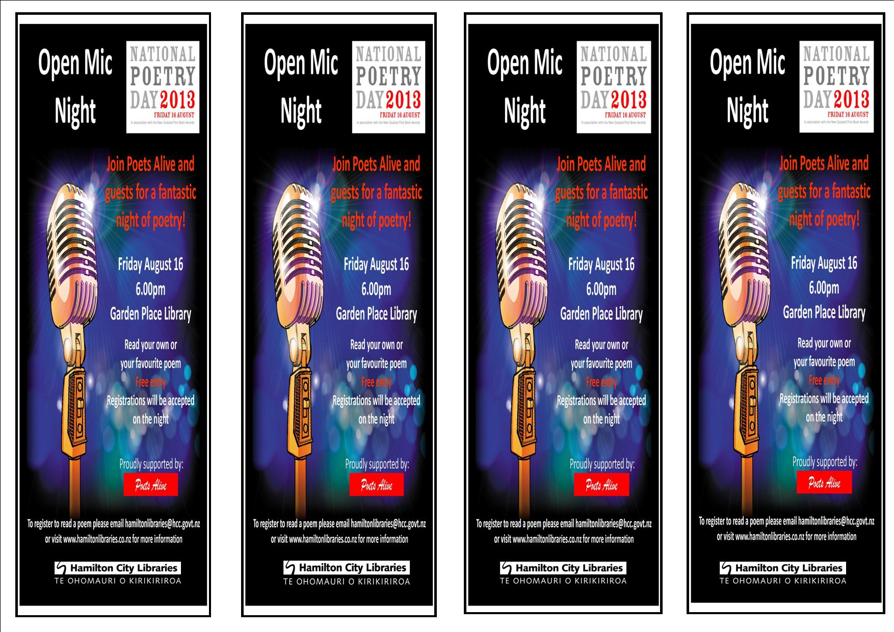 Hamilton Poetry Day Committee came up with all sorts of events to celebrate National Poetry Day. Bookmarks were given out in shopping malls and at Garden Place. There was a roving poet. There was an open-mic night and a Wintec Poetry Competition open to all residents (results on the Wintec and Hamilton Library sites). Carrie Barber came first and second. Hard work for all of those behind the scenes, but great to see a flourish of poetry in a range of ways.