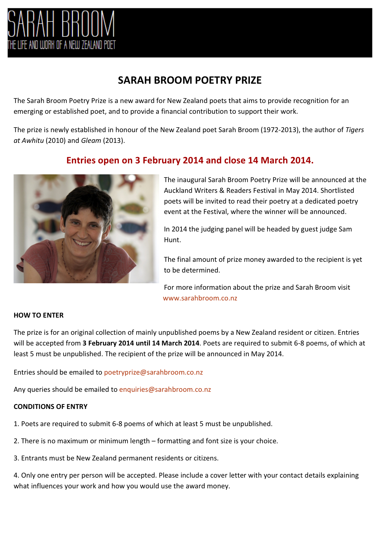 Rhian Gallagher: Sarah Broom’s Tigers at Awhitu is a collection I continue to re-read. Her second collection Gleam, published posthumously, is her courageous reply to death. Amy Clampitt wrote: ‘Nobody is ever ready for the feel of the raw edge/between being and nothing’. It’s this raw edge that Broom illuminates for us. I have no idea how she managed to write these poems. What a gift.