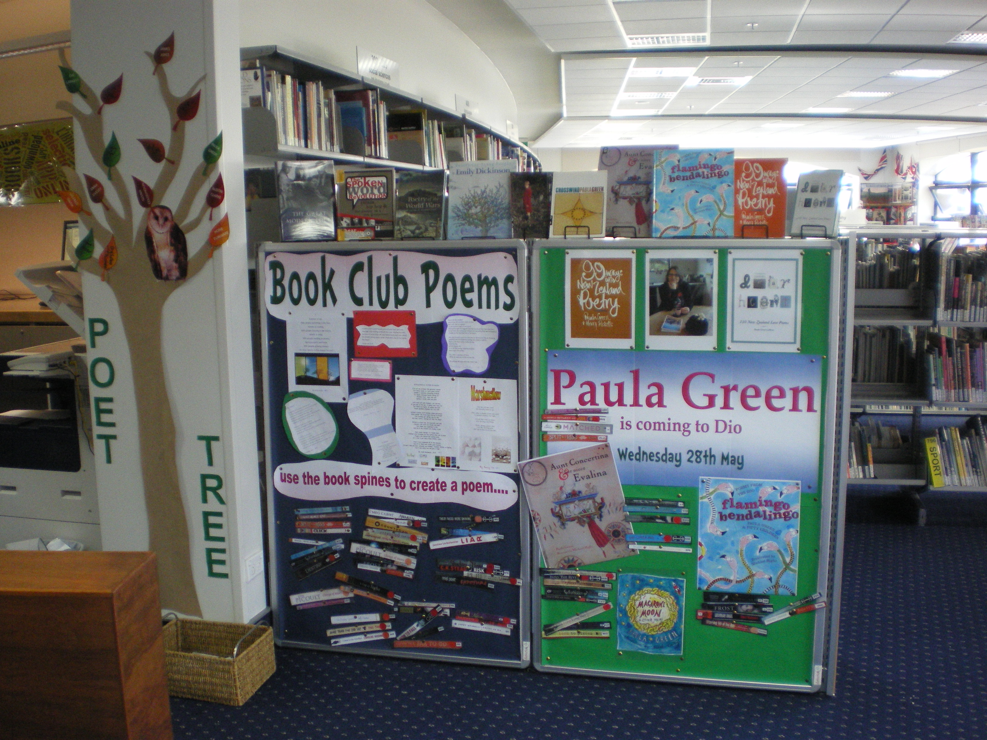As an author it is especially rewarding to visit a school that displays your work! I visited Auckland’s Dio recently and was thrilled to bits with this display and the book-spine poems. The library hosted a lunch of sandwiches and cakes for the students librarians, the English teachers and members of the School Book Club after my morning visit. It was a terrific idea as I got a chance to talk to some enthusiastic, young writers in an informal setting. Thank you!