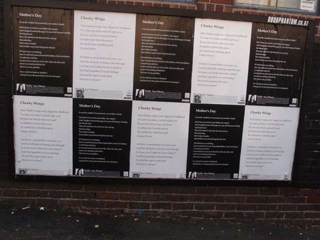 You are asking me where I have been particularly happy to put a poem poster? I have been putting up posters for bands and the like since I was 16 years old. I am now 63 and I have heard the words ‘you can’t put that there’ more than anyone in New Zealand, I am sure. I was delighted to get a Hone Tuwhare poem poster right opposite the main gates of Parchman Farm (The Mississippi Federal Penitentiary) in Mississippi. You aren’t allowed to stop on that road for a mile or so either side of the main gates, but I did and the screws came running. The poem poster went up! Also I did a lot of Janet Frame poem posters in Baltimore and at Princeton University. I felt every single one I put up.