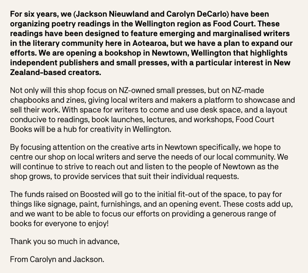 We (Carolyn DeCarlo & Jackson Nieuwland) are opening a bookshop in Wellington that will feature exclusively books by independent publishers and small presses. This is an expansion of our project Food Court, a reading/zine series that we’ve been running for the past six years. Poetry will obviously be a big focus for us at the bookshop!