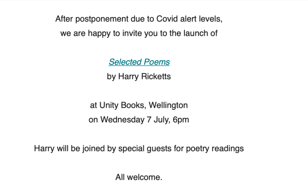 Harry Ricketts teaches English Literature and creative writing at Victoria University of Wellington Te Herenga Waka. His latest collection Selected Poems was published by Victoria University Press, 2021.