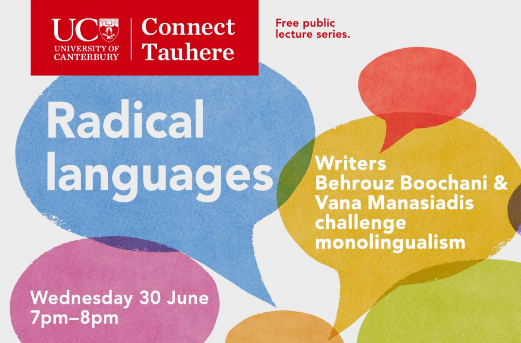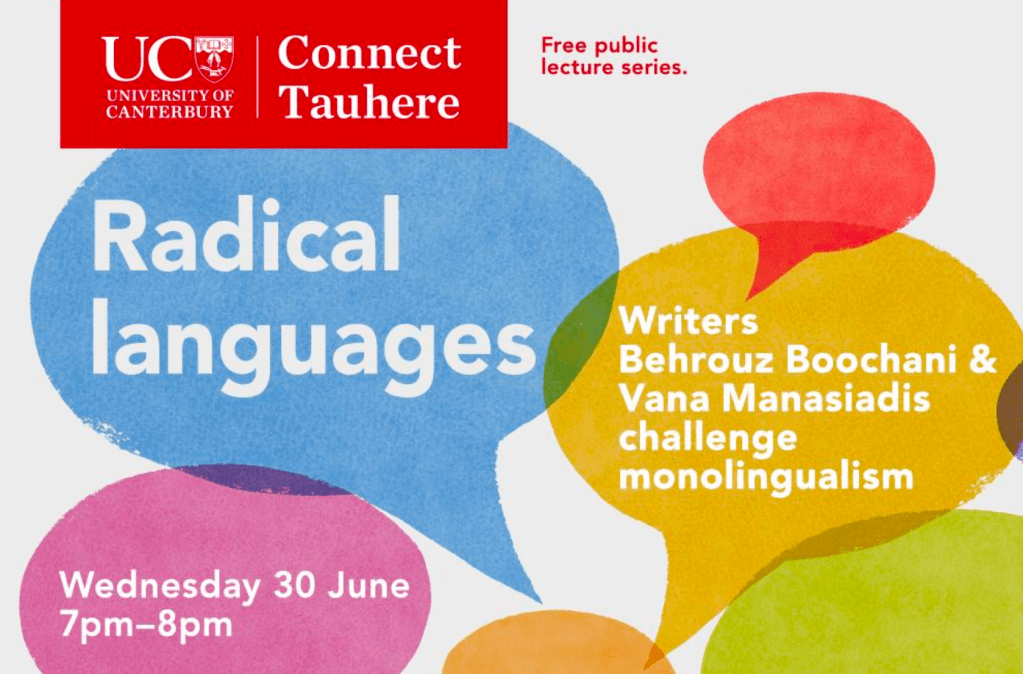UC Connect public lecture –Radical languages:Writers Behrouz Boochani & Vana Manasiadis challenge monolingualism, Presented by UC Arts writers-in-residence Behrouz Boochani and Vana Manasiadis, moderated by Professor Philip Armstrong, University of Canterbury, from 7pm-8pm, Wednesday 30 June 2021 – C1 lecture theatre in C-Block, Ilam campus, University of Canterbury. Register free to attend: https://www.canterbury.ac.nz/public-lectures/
