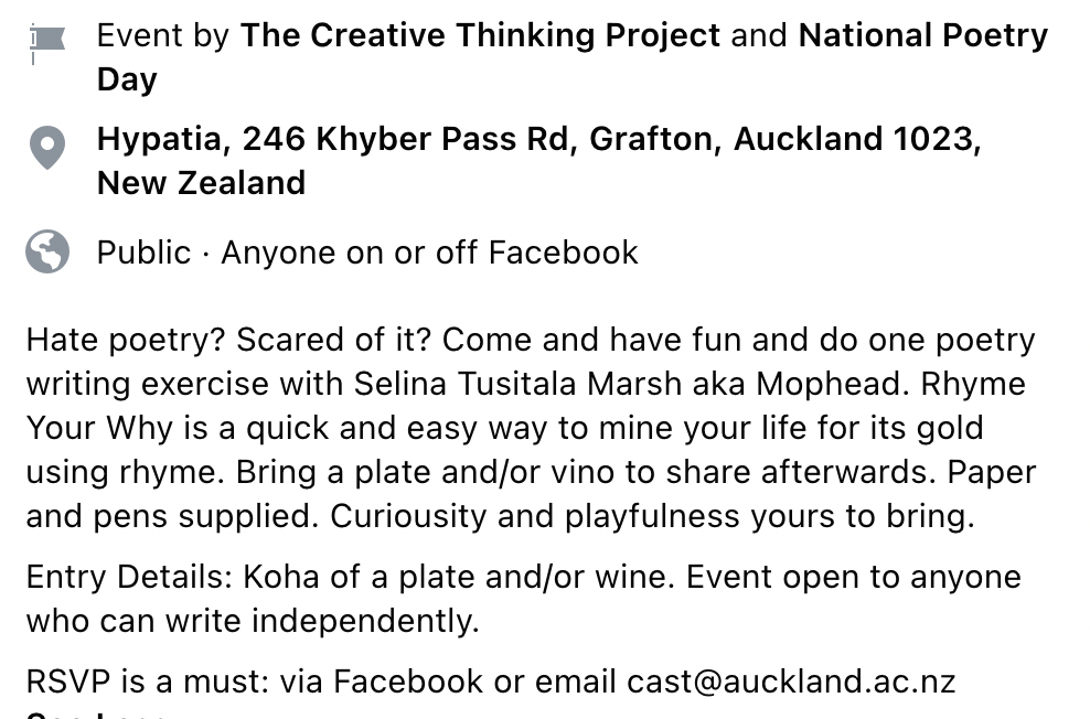 Music is the first poetry attraction for me. I am drawn to poems that sing. Poems sing in multiple keys with affecting and shifting chords, rhythms, harmonies, counterpoints, pitch, cadence, codas, crescendo. Tune your ear into the poetry of Karlo Mila, Emma Neale, Sue Wootton, Bill Manhire, Hinemoana Baker, Michele Leggott, Nina Mingya Powles, Lily Holloway, Alison Wong, Chris Tse, Mohamed Hassan, Gregory Kan, Anna Jackson, David Eggleton and you will hear music before you enter heart, mystery, experience, startle. Take a listen to Bernadette Hall or Dinah Hawken or Anne Kennedy. Anuja Mitra. Louise Wallace. How about Grace Iwashita Taylor? Ian Wedde. Tusiata Avia. Tayi Tibble. Rebecca Hawkes. Helen Rickerby. Selina Tusitala Marsh. Murray Edmond. Apirana Taylor. Iona Winter. Rose Peoples. Sam Duckor Jones. Vincent O’Sullivan. Kiri Pianhana-Wong. Jackson Nieuwland. Serie Barford. Listening in is of the greatest body comfort and you won’t be able to stop leaning your ear in closer. I think of one poet and then another, to the point I could curate an anthology of musical poets. I can name 100 without moving from the kitchen chair. Ah. Bliss.