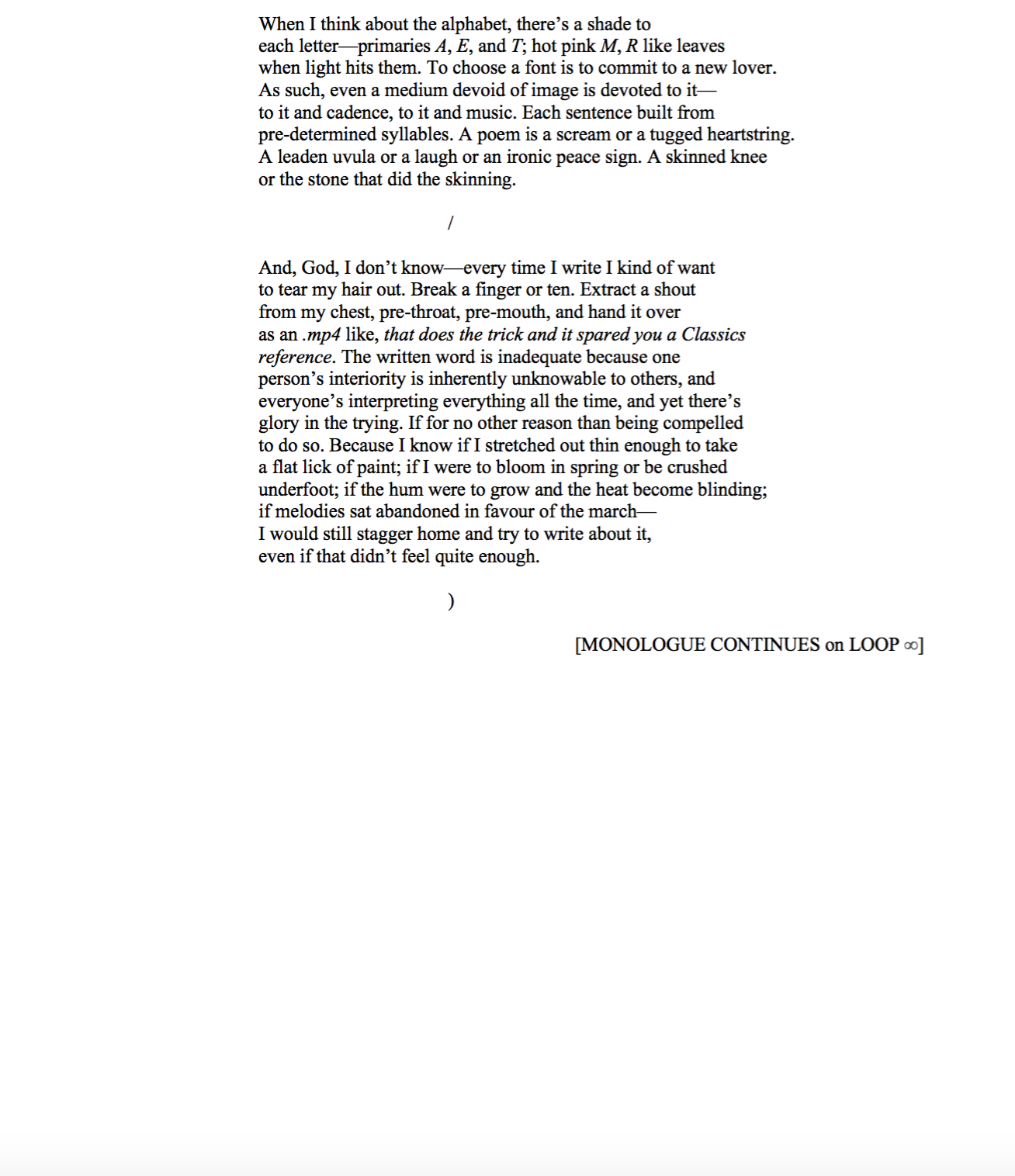 Eliana Gray is a poet, youth worker and arts facillitator. They like queer subtext, collaborative writing and making sure people have a nice time. They have had words in: SPORT, Landfall, Poetry NZ, Mayhem, and others. Their debut collection, Eager to Break, was published by Girls On Key Press in 2019, and in 2020 they undertook residencies in both Finland and Ōtepoti.