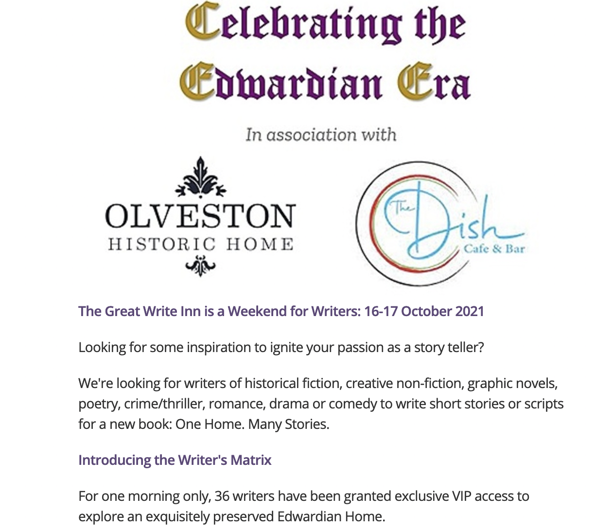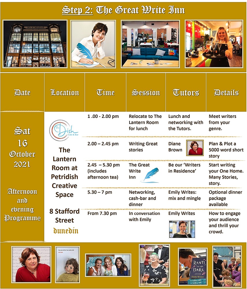 The Great Write Inn is a Weekend for Writers: 16-17 October 2021 Created by writers for writers, featuring Catherine Chidgey, Diane Brown, Emily Writes, Fiona Farrell, Amy Scott, Fiona Cole, Emma Neale, Beverly Martens and other special guests.