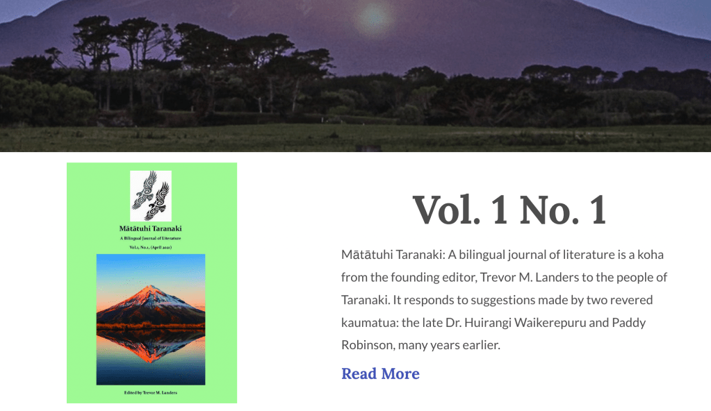 ‘Huirangi’s urging was for unification between the peoples of Taranaki, recognising and celebrating our commonalities and differences. Paddy recognised in Trevor the skills to support the revitalisation of Te Reo Māori (done so capably by others) by providing a forum for Māori, Pākehā and Tauiwi to express a uniquely Taranaki identity in Māori, English (and other languages by negotiation). The bumper first edition is a proof of concept. In true Taranaki gate style, it might not be the flashiest website at this stage, but it provides a showcase of the enormous literary talent in Taranaki.’