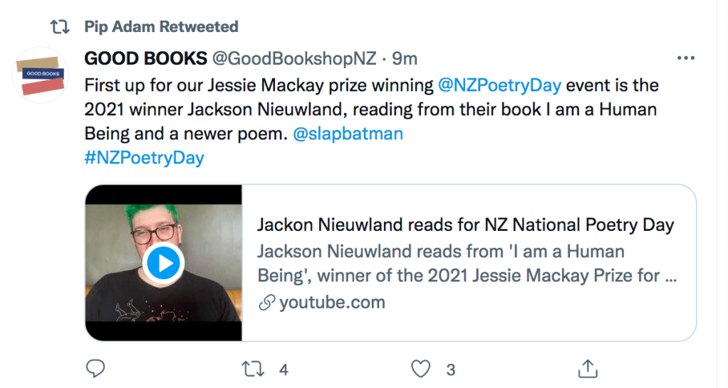 I also want to make up a few poetry-book care packages. If you are in need of a poetry boost let me know (only in NZ). I won’t be able to send anything until Auckland moves to Level 3.