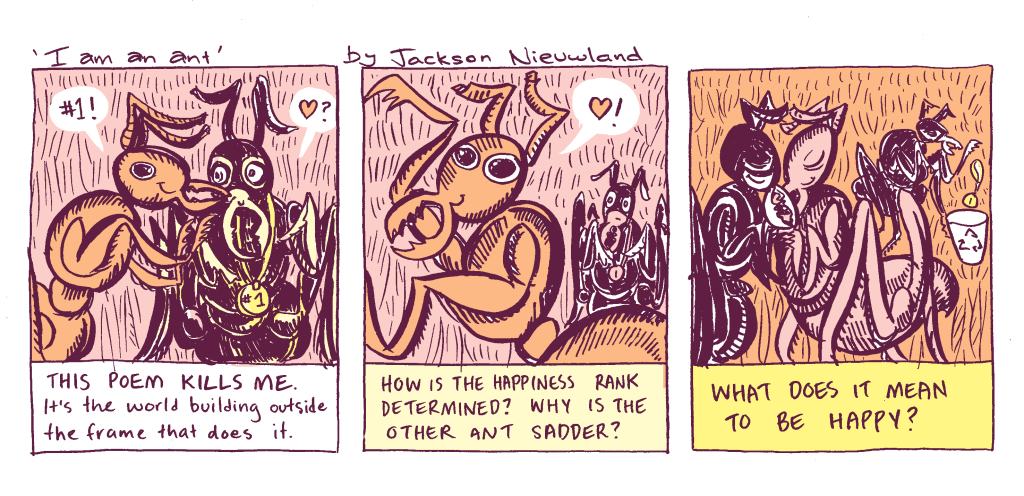 Jackson Nieuwland is a human being, duh. They are a genderqueer writer, editor, librarian, and woo-girl, born and based in Te Whanganui-a-Tara. They co-founded the reading/zine series Food Court. This isn’t even their final form. Their debut collection, I Am a Human Being, won Best First Poetry Book at the Ockham NZ Book Awards 2021.