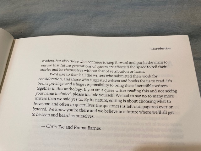 Chris Tse and Emma Barnes have responded to the erasure of queer identities in a national literature that was traditionally dominated and controlled by white heterosexual men. Chris and Emma opted to use ‘Takatāpui’ and ‘LGBTQIA+’ in the title to signal Aotearoa’s rainbow communities within the broadest possible reach. They have used the word queer in their introduction and underline that that must make room for as many ‘labels and identities’ as necessary. I am using the word queer with similar intentions.
