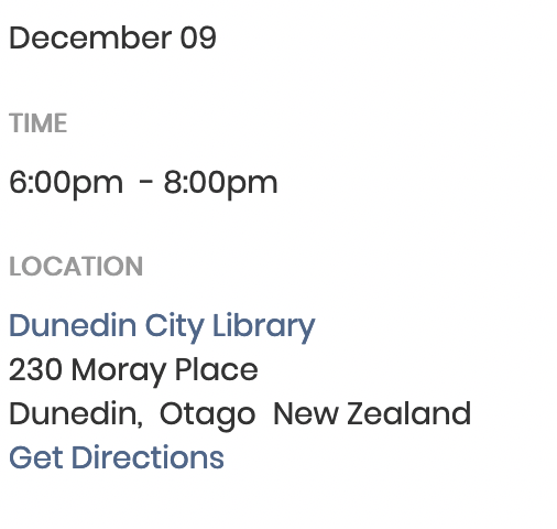Presented by Dunedin Public Libraries in partnership with Otago-Southland NZ Society of Authors and Dunedin UNESCO City of Literature with the support of Phantom National Poetry Day and University Bookshop Otago