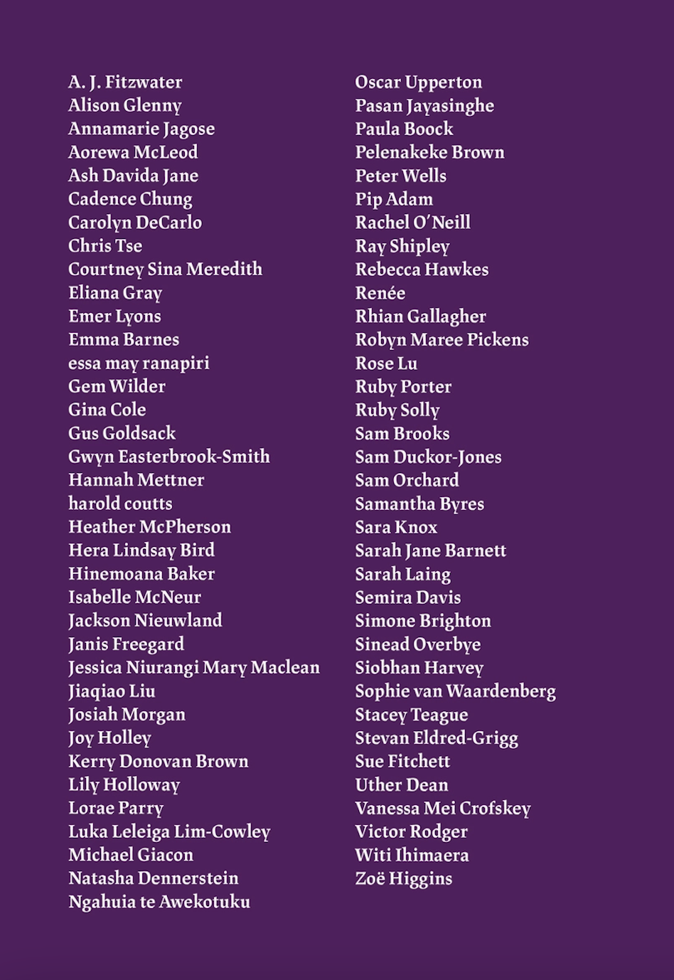 Majella Cullinane – Lynley Edmeades – Sophia Wilson – Richard Reeve – Carolyn McCurdie – Emer Lyons – Megan Kitching – Liz Breslin – Emma Neale – Jenny Powell – Kay McKenzie Cooke – Michelle Elvy – Victor Billot