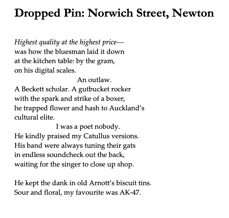 Poetry Shelf Monday poem: Michael Steven’s ‘Dropped Pin: Norwich Street, Newton’ Leave a reply — in memory of Rick Bryant Michael Steven Michael Steven lives and writes in the Waitākere region of Tāmaki Makaurau. Share this: Click to share on X (Opens in new window) X Click to share on Facebook (Opens in new window) Facebook Click to print (Opens in new window) Print Click to email a link to a friend (Opens in new window) Email Like Loading... Related