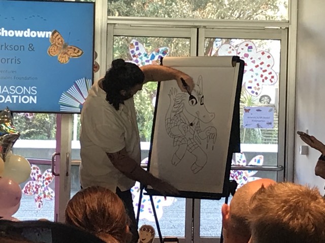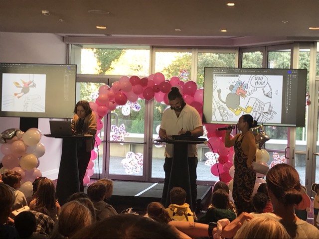 On my way to my Saturday session with Elizabeth Acevedo, Saraid de Silva and Tsitsi Mapepa – ‘Writing across Generations’ – I spotted Gareth and Louise Ward and stopped to say hi because this is one of the best things about the Festival – connecting with other passionate book folk. Louise proceeded to demonstrate her bookselling skills and I went straight off to buy Acevedo’s new book Family Lore. The session was wonderful, all three writers sharing generously on family and their fab books. Later I met up with fellow writer Jane Bloomfield for a good natter and then I was off to the Illustration Duel between Toby Morris and Giselle Clarkson. This theoretically was for the younger set but the adults in the audience were enjoying it just as much as the children. So much talent, so much networking, so much fun.