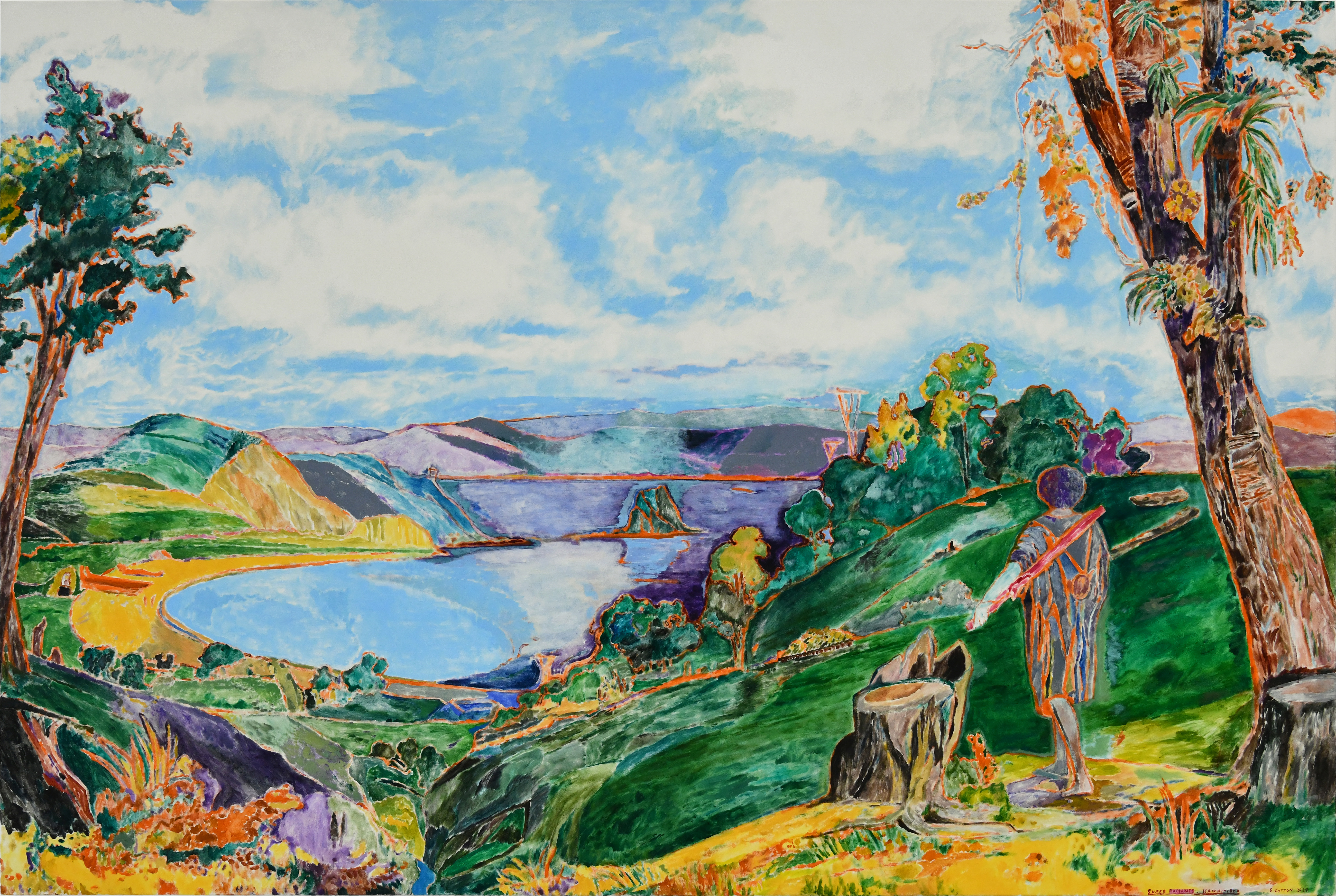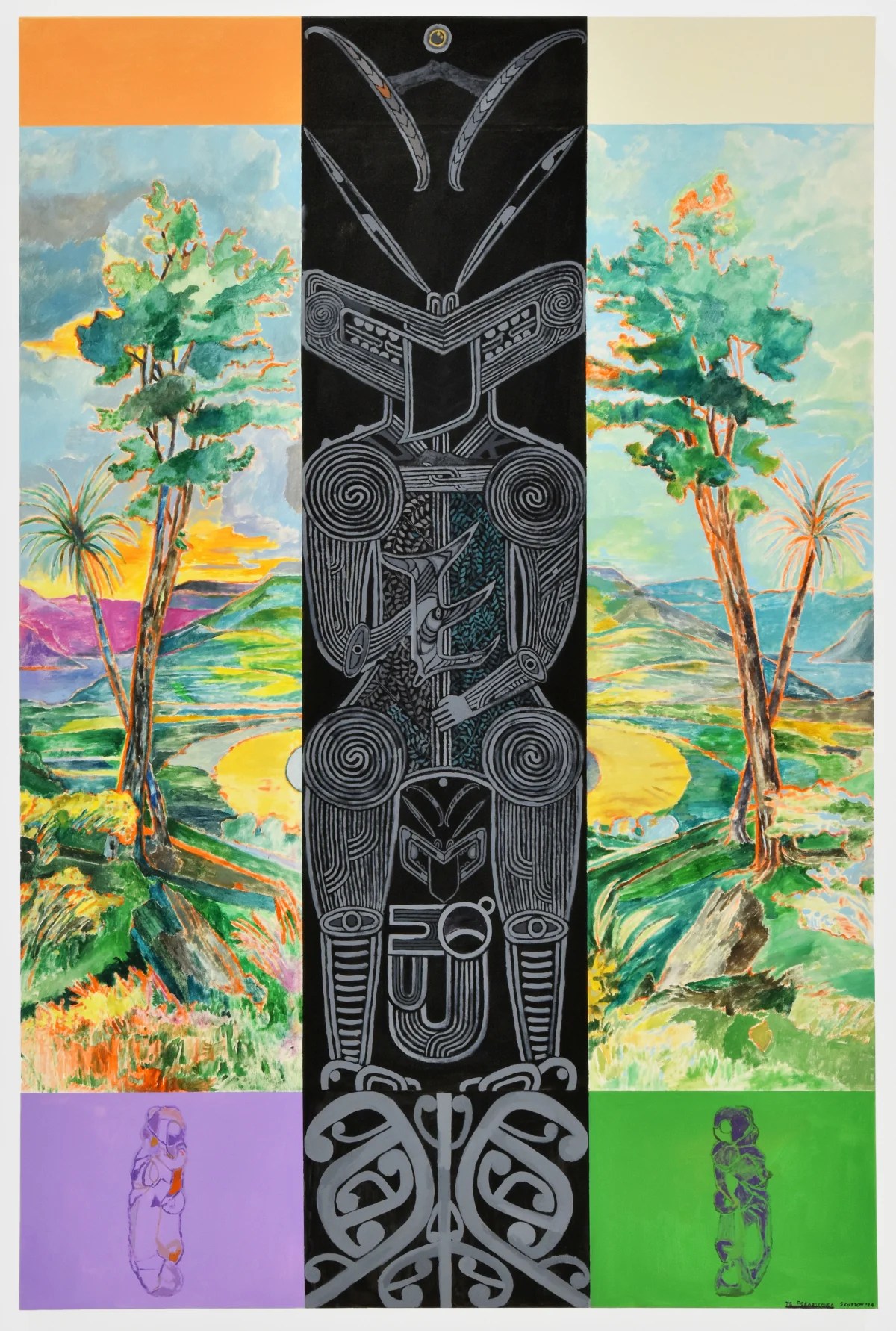 Narrative. After colour you might enter narrative. Each work carries story, close to the surface, deep set, woven, threaded, refracting, colliding, Indigenous, European, inhabited by ancestral figures. Personal. Intimate. The titles of the paintings underline the narrative scope. For example: ‘Up the Creek’, ‘Internal Visitor’, ‘The Will of the Devil’, The Laughing Tree’, ‘Sunset Gate’, ‘Rahiri’s Light’. I recommend reading Anthony Byrt’s terrific accompanying essay as it opens up the narrative richness, from colonial collisions, Ngāpuhi ancestors, the foregrounding of whakapapa, metaphorical possibilities, slippages, hybridity, visual and thematic chords. I see the exhibition as planting roots and tendrils in both new and old ground, navigating how and why we tell stories, have told stories, and must continue to tell stories in whatever form.