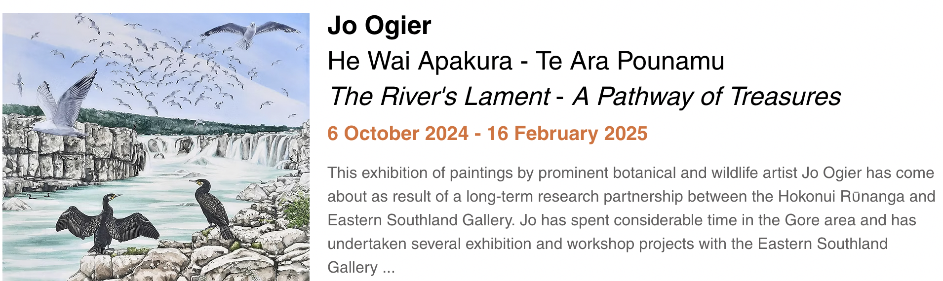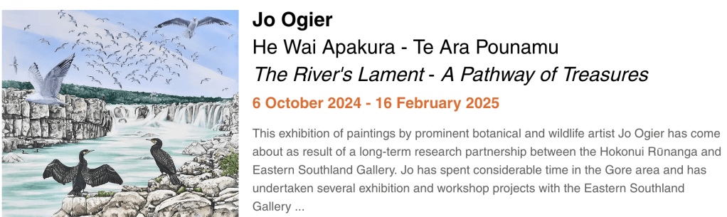 Kia ora everyone, one of my highlights this year has only just happened. It was my second visit to the Hone Tuwhare crib at Kākā Point in the Caitlins. The Hone Tuwhare Trust led by Jeanette Wikaira and Rob Tuwhare marshalled the expertise, efforts and aroha of Hone Tuwhare’s huge community and whānau to restore the crib. Big Congratulations to the Trust and their many supporters who have also established a writers and artists’ residency. After visiting Rob and Manaia Tuwhare at the crib and having a kai (venison!) and a kōrero there, we went on into the Catlins—the forests, Cathedral Cave, the Pūrākaunui Waterfalls, swimming at Papatowai estuary and then driving up the Owaka Valley to Mataura to see the effects of industrialisation on the Mata-au or Clutha River, and then into the amazing Gore Museum with the Ralph Hotere collection rich in poetry from Hone Tuwhare, Cilla McQueen, Bill Manhire and Ian Wedde and art from Marilyn Webb. One amazing part of the collection was the resurrection of the Mata-au through the imagination of botanical and wilidlife artist Jo Ogier. Her series of bird, fish and water-scapes, called “He Wai Apakura – Te Ara Pounamu, The River’s Lament – A Pathway,” was painted with support from the Hokonui Rūnanga of Kāi Tahu. Instead of the freezing works, and the abandoned papermill, there was a healthy river with its endowment of native flora and fauna. The exhibit by Jo Ogier will be there until the end of summer.