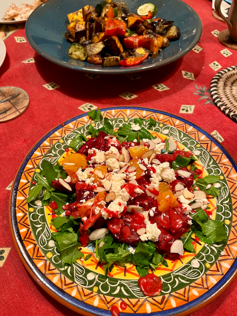 Two supremo salads. ‘Grilled vegetable salad with crushed olive dressing’. The kind of recipe you can adapt to fit what is in your fridge or cupboard or garden. So I used zucchini, eggplant, mushrooms, red peppers – and fresh garden rocket. Loved the dressing. No sherry vinegar so I tried cider vinegar with a splash of honey. Yum!! Also made ‘Roasted beetroot & orange salad with a berry dressing’. It’s winter so I used nz mandarins instead of imported oranges, and thawed some organic raspberries for the dressing.