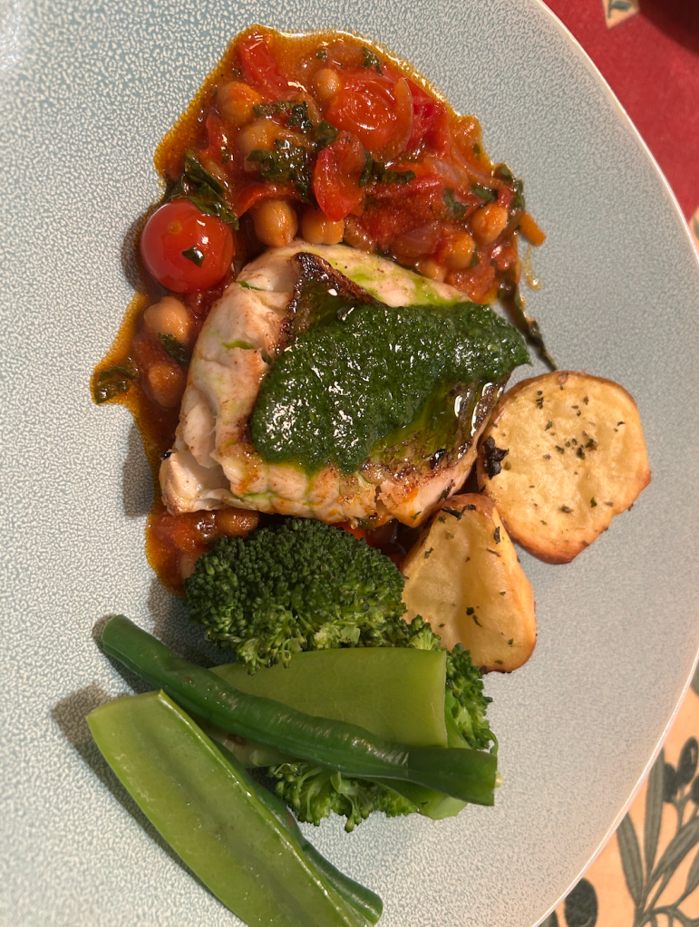 ‘Crispy skinned fish with smoky chickpeas & lime & herb oil’. Super tasty, super harmonious, with spinach, dill and parsley from the garden, it’s a family hit.