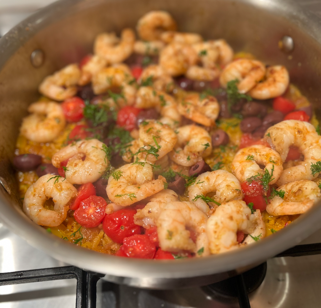 Another night I used the paella recipe as a launchpad, partly because I can’t use a BBQ at the moment, and also because I only had prawns on hand. I made a paella, with the divine presence of saffron and paprika, scattered over some baby tomatoes and halved black olives, then side-stepped and sautéed the prawns quickly in rose-harissa paste and tossed them on top with a good handful of chopped dill. Excuse the steamy photo!