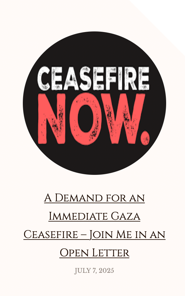 Mandy Hager has written an open letter calling for an immediate Gaza ceasefire. She was inspired by writers in UK and Ireland to create a similar letter and collect signatures from other writers and publishers. She writes: “In May 2025, 380 UK and Irish writers signed an open letter calling for an end to this. They have kindly allowed me to use their wording, which, in turn, was adapted from a similar open letter drafted by France’s writers.”