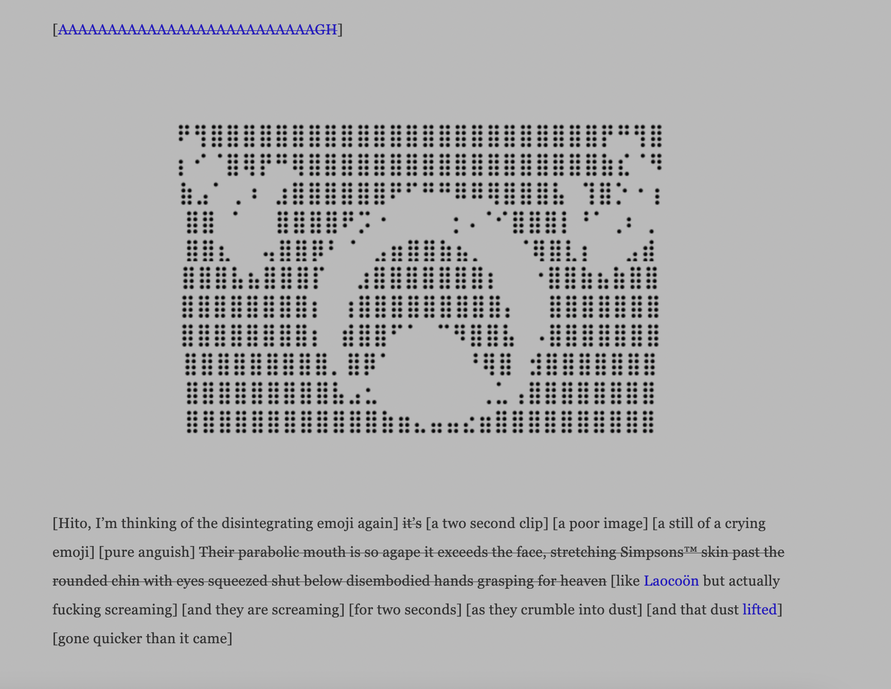 I can get quite defensive of visual poetry – I never want people to think the ‘conceit’ or aesthetic identity of an effective poem nullifies or overpowers its content at line level. (In the same vein, I’m not overly interested in internet poems for internet poems’ sake; there needs to be something that grounds or further substantialises the work.) Any form can be a great act of assemblage, but the writing still has to stand out. And that’s something I love so much about this poem – that even if you stripped away all the rest of the work it’s doing, there would still be descriptions like ‘a poor image’, ‘pure anguish’, a ‘parabolic mouth is so agape it exceeds the face’, ‘disembodied hands grasping for heaven’. You would still have the immediate internal assonance of ‘Simpsons™ skin’ and ‘rounded chin’, the inbuilt, square-bracketed/struck-through pace shift of ‘[it bothers me] that lost scream [because that felt real] [wasn’t it] [someone’s scream] that then [became image] then [language]’. You would still have the closing lines to settle any of the destabilisation of what’s come before; the calm (characteristically struck-through, occasionally bracketed and linked) sentence function: ‘On Twitter [X] people just signal it like that. I want to tell you what it means but I’m not sure I even know, Hito. I think it may be a kind of speechlessness, the kind that calls you offscreen. I think you follow the scream elsewhere.’