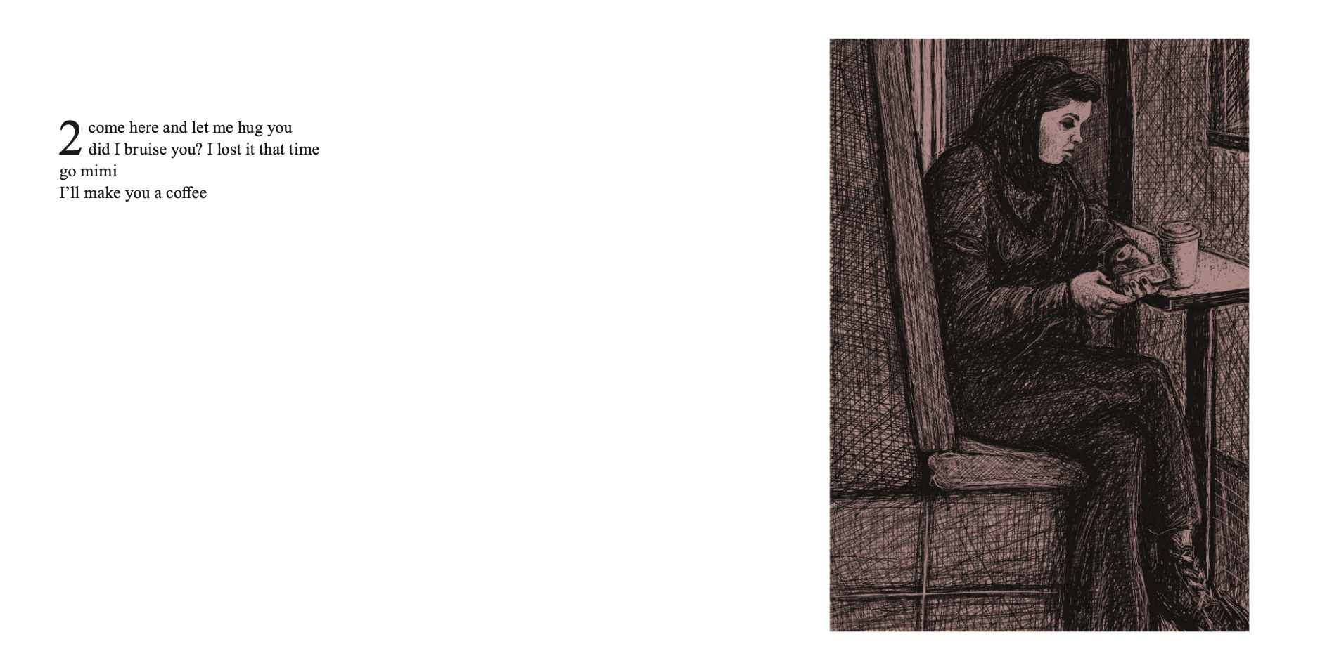The memoir is a collaboration, a contiguous relationship between word and image, between artist and writer, and this brushing close, this besidedness as the blurb says, is utterly fertile, utterly heart expansive in its reach. I am stretching for words, and they slip away. So I sit here on the rim of weeping, weeping at the way I’m brought cheek to cheek with the sharp edges of humanity. The shadows. My shadows. The unspoken. My unspoken. There in the cafe settings. There where dark brushes against light, where isolation and loneliness are rife. There where stories are shared, and equally stories are held back. Darkness and light.