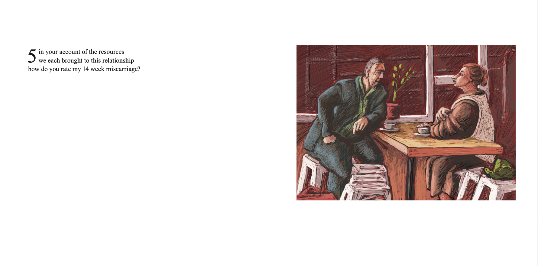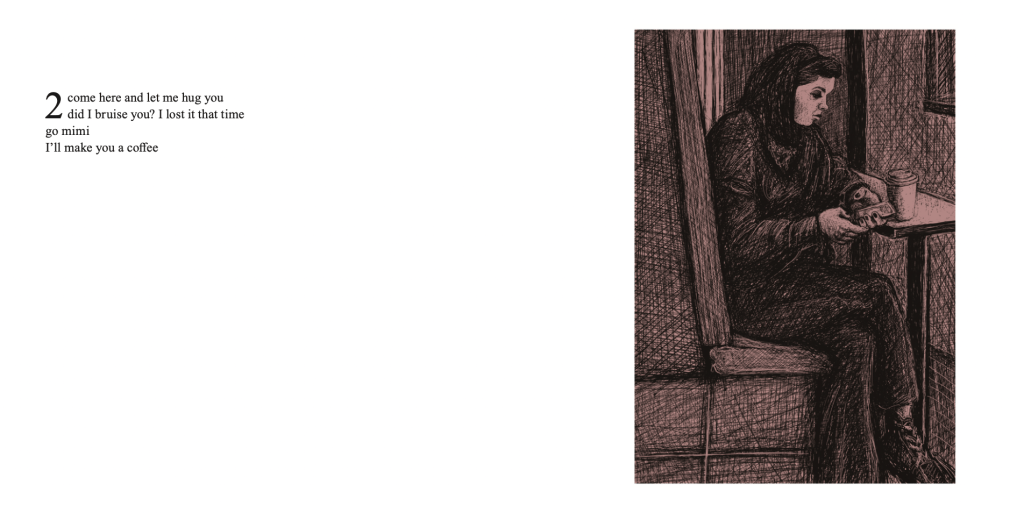 Probably against the grain of reading a sequence of images and text, I look at Elizabeth’s images first. She produces all the drawings on her iPad using the Procreate drawing app, recording her observations in cafes or buses. I am absorbing the people frozen in a cafe moment, those on phones, those alone, those in groups, those with son or daughter, and each scene amplifies an intensity of mood. I can’t think when I have last felt portraits to such a degree. I feel the gaze of the eyes, the expression on the face. I feel the unspoken, and more than anything, the way we become a catalogue of memory, experience, pain, aroha, longing, recognitions.