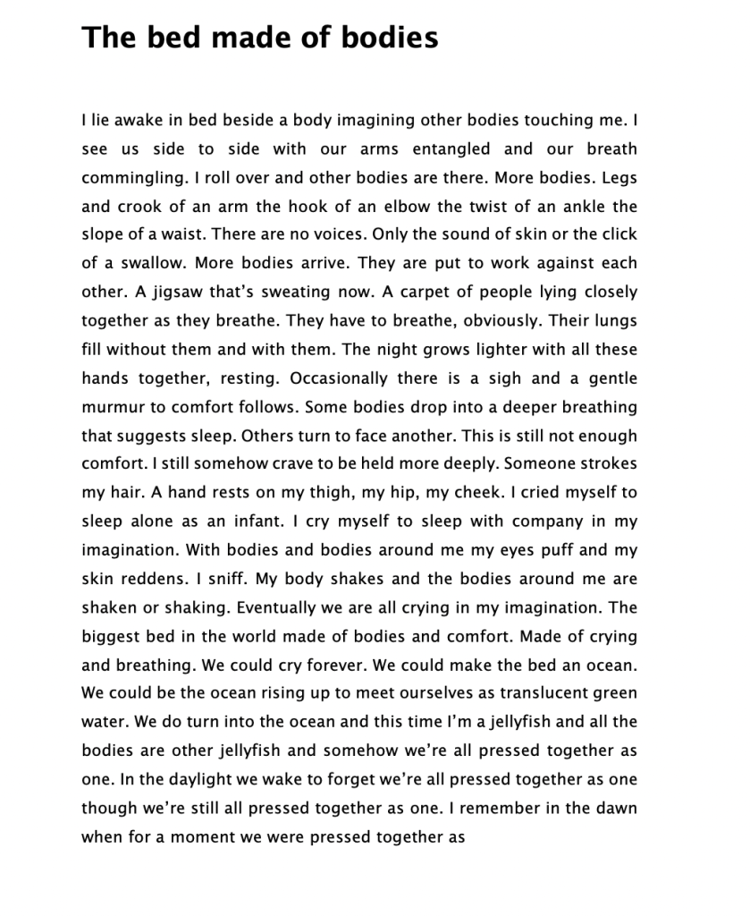 I am an unmade bed. I am a single thing made up of many other things. I am a reason, a raising, a roof to be raised. I am a song you sing in your sleep. I am a collection of dots. I am a need you buried in the back garden. I am a literal spray of light across a wooden floor in a house where the sun has only just returned. I am a musical phrase. I am a lead light. I am a host. I am seven different names. I am all the fat in my body. I am the sky when it is early spring and I can’t believe I exist in this colour range. I am so blue.