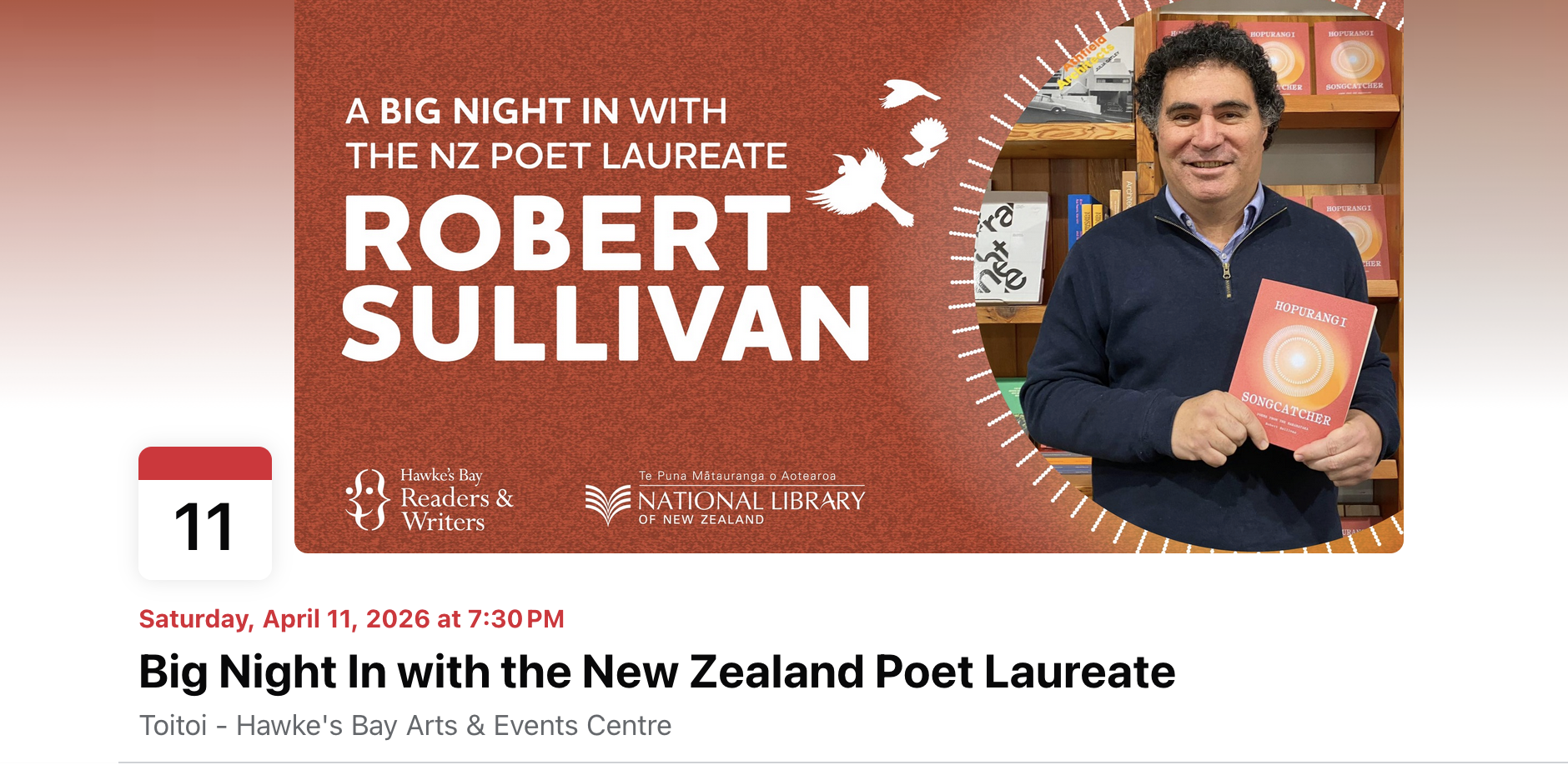 Join us for a wonderful evening of words with New Zealand Poet Laureate Robert Sullivan and his guests Amber Esau, Kiri Piahana-Wong and Ariana Tikao.