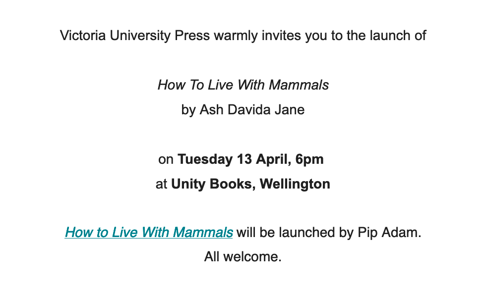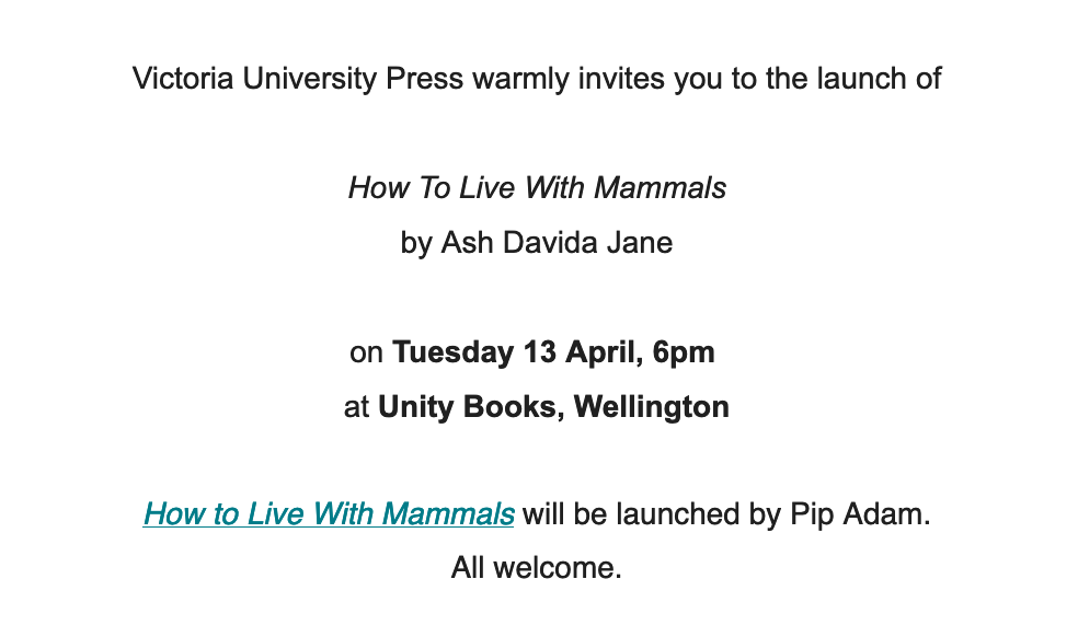 My biggest, longest poetry highlight of this year was being in Anna Jackson’s class, ENG112 Literature of Aotearoa! She invited poet after poet into our class, just about every lesson was a reading, minus the free wine and cheese. Being in Anna’s presence with poetry is a wonderful thing. She is true and free in her discussions about poetry and I love it. She is also one of the only people who I notice will give time and thought to anything that anybody puts their hand up to say. Which often took us somewhere unexpected and entrancing. So, thank you Anna! It was in this same class I properly acquainted myself with Rebecca Hawkes’ and Helen Rickerby’s poetry. Poetry which has since become top of the pops for me. This leads me to my other highlight which was having both of them + Mel Ansell read at the launch of my chat book, horse power. I considered myself on a whole new planet of lucky to have had them there and reading. They each brought a different strength to the whole shebang, so thanks to you three as well! You’ve made my year for poetry!