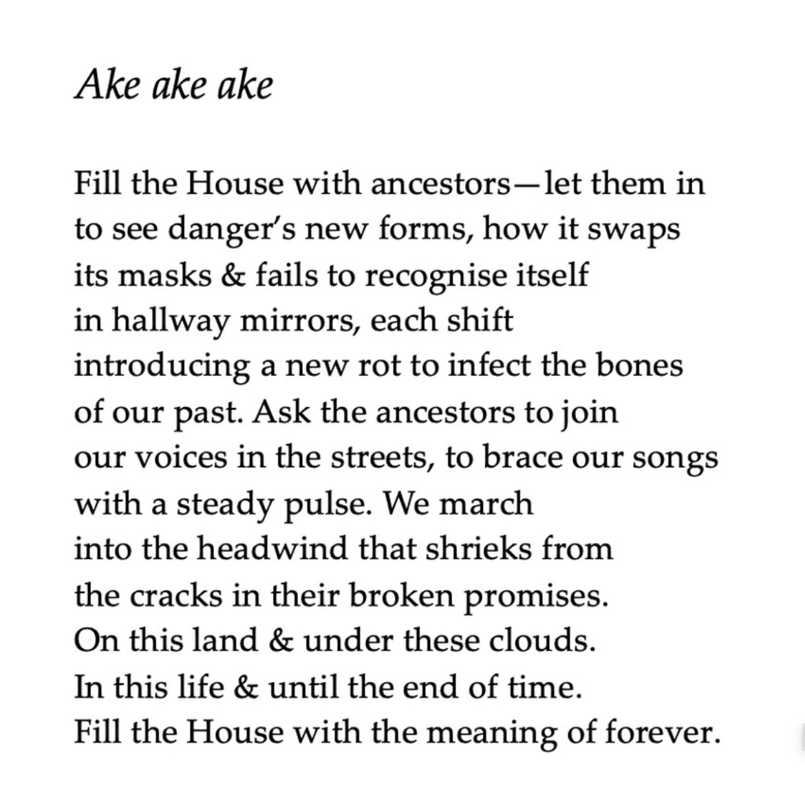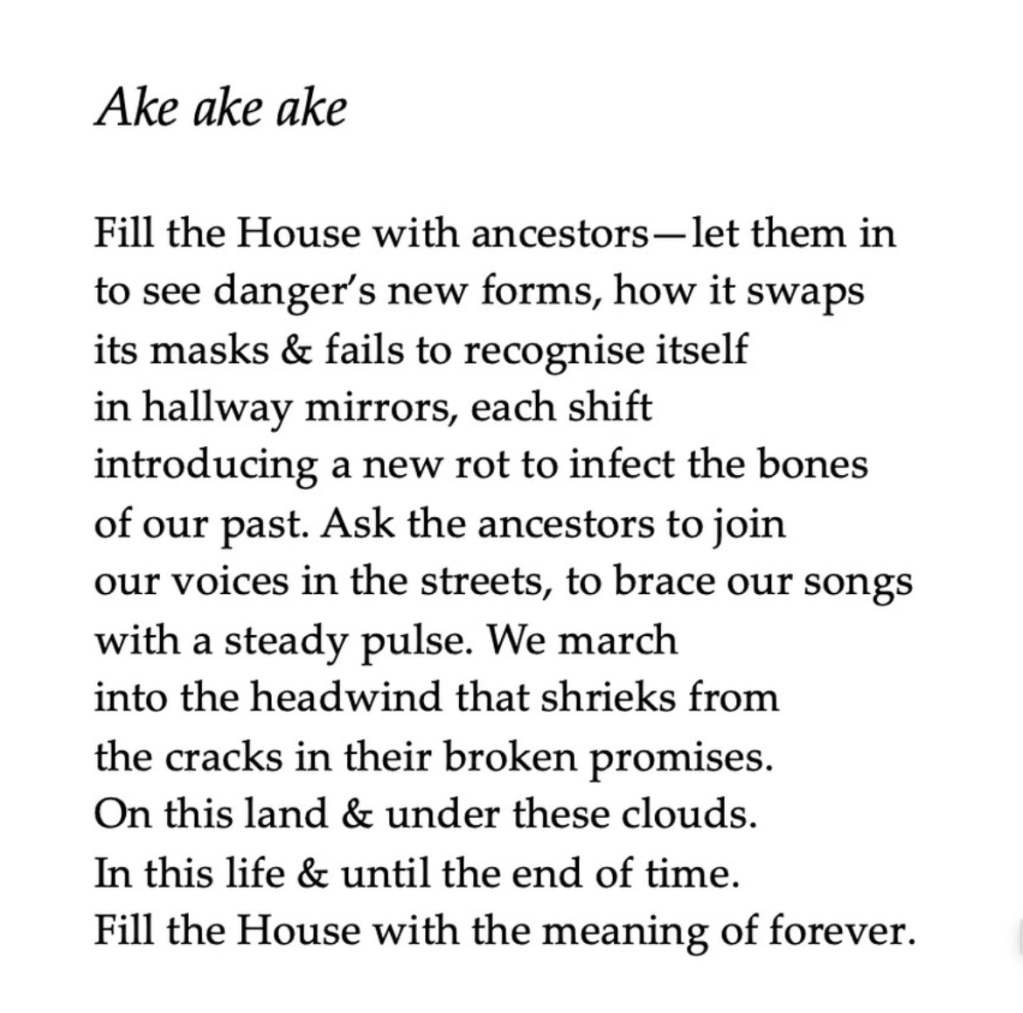 These poems include Omar Sakr’s pieces on the genocide in Palestine (a thank you to Starling Editorial Committee member, Khadro Mohamed for bringing me back to this series), many of which can be read on and shared from his Instagram and will be published by University of Queensland Press as The Nightmare Sequence in 2025. On the same topic – Loretta Riach’s devastating ‘Reverse Tragedy’ from Starling Issue 18. Finally, Chris Tse shared a scorching poem ‘Ake ake ake’ (pictured above) following the November hīkoi in response to the proposed ‘Treaty Principles Bill’ – it is of course, not too late to make a submission on the bill here.